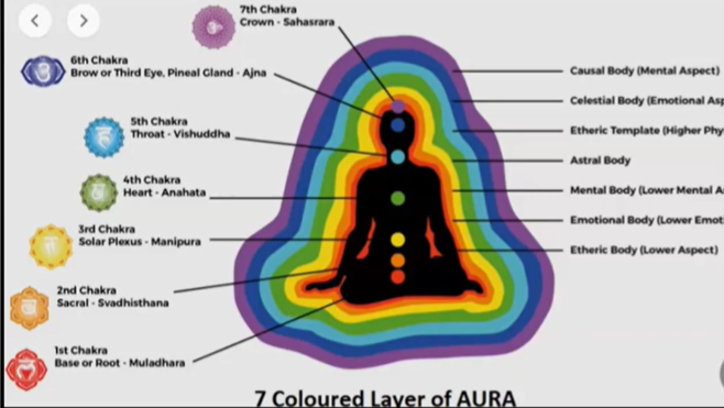 - 인도의 아유르베다 이론에 따르면 일곱 가지 아우라 레이어가 존재하며, 이는 힐리 관련 프로그램에도 들어가 있는 가장 많은 사람들이 이해하는 이론이다.