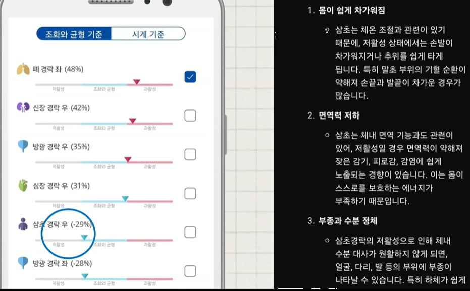 - 경락 카드 설명을 탭하여 해당 장기가 하루 중 언제 가장 활발한지 확인할 수 있다.