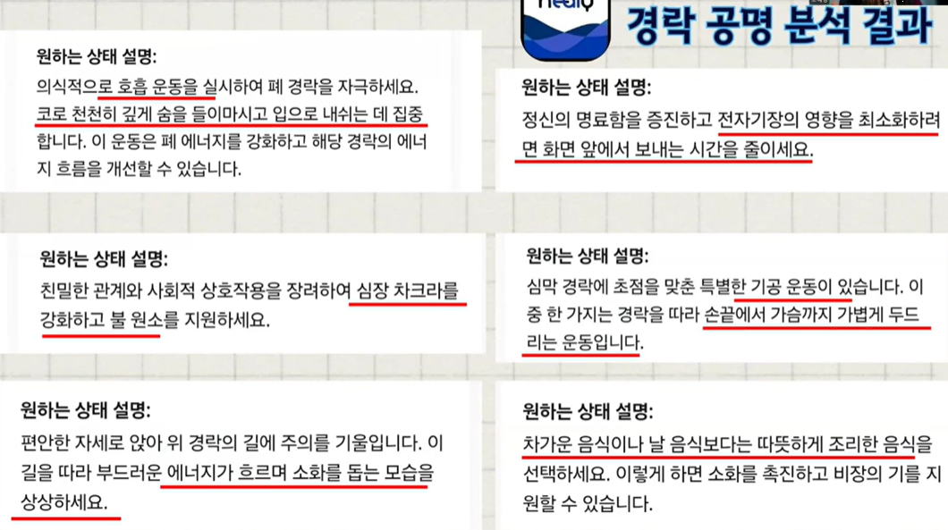 - 심층 분석: 문제가 된 경락의 점이 우리의 심리적, 무의식적, 감정적인 부분과 어떻게 연결되어 있는지 데이터 심층 분석을 통해 알아본다.