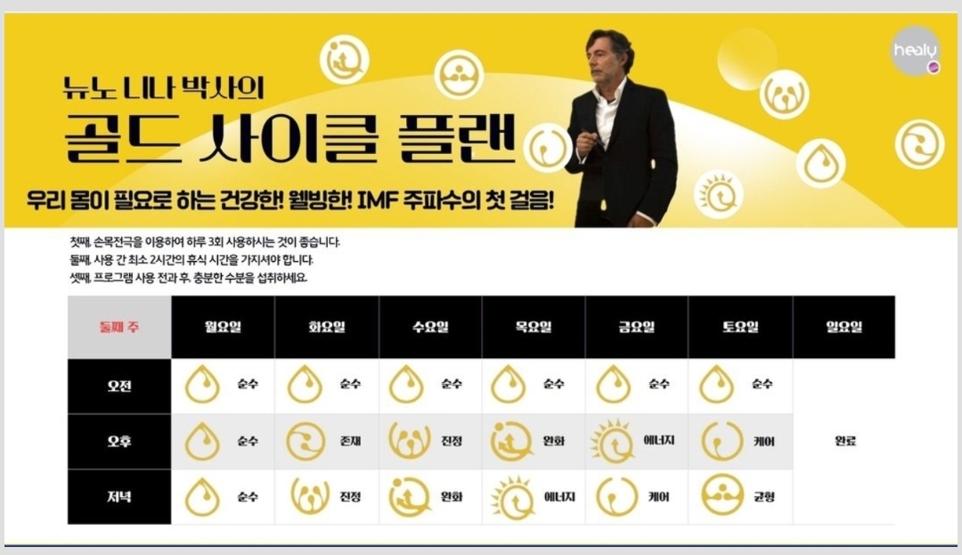 - 골드 사이클을 통해 에너지 클렌징을 한 후 주파수 영양제를 받아야 효과가 극대화된다